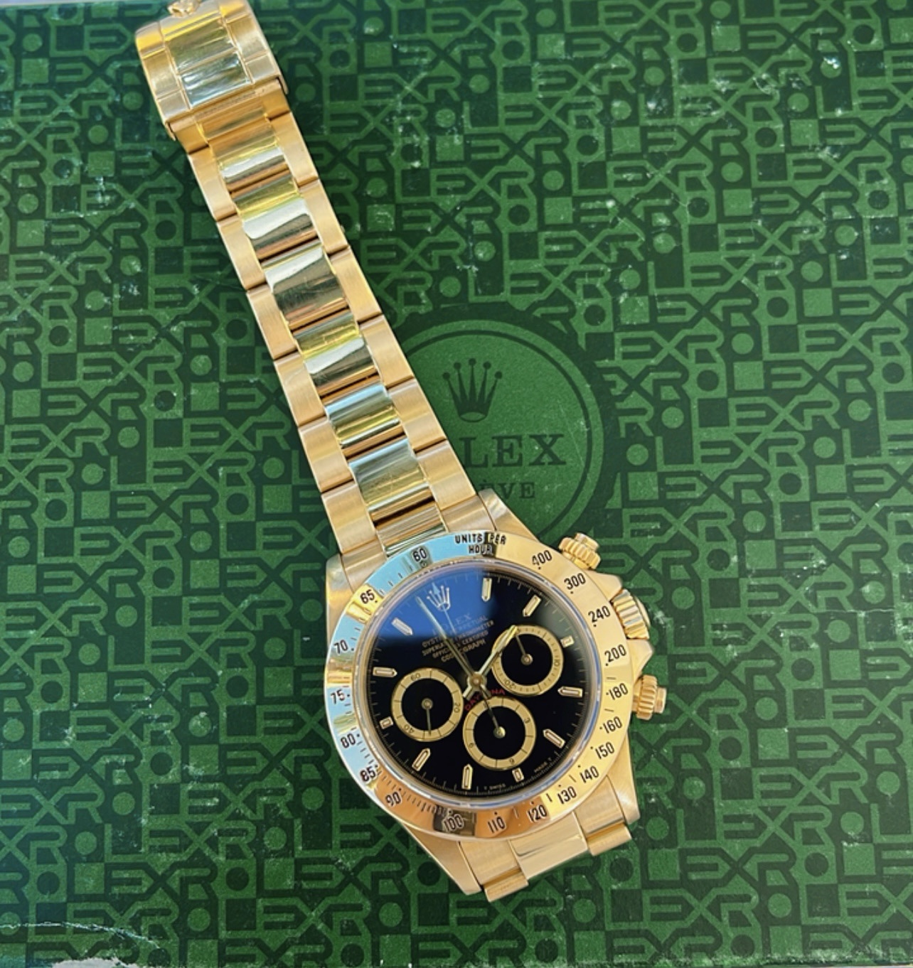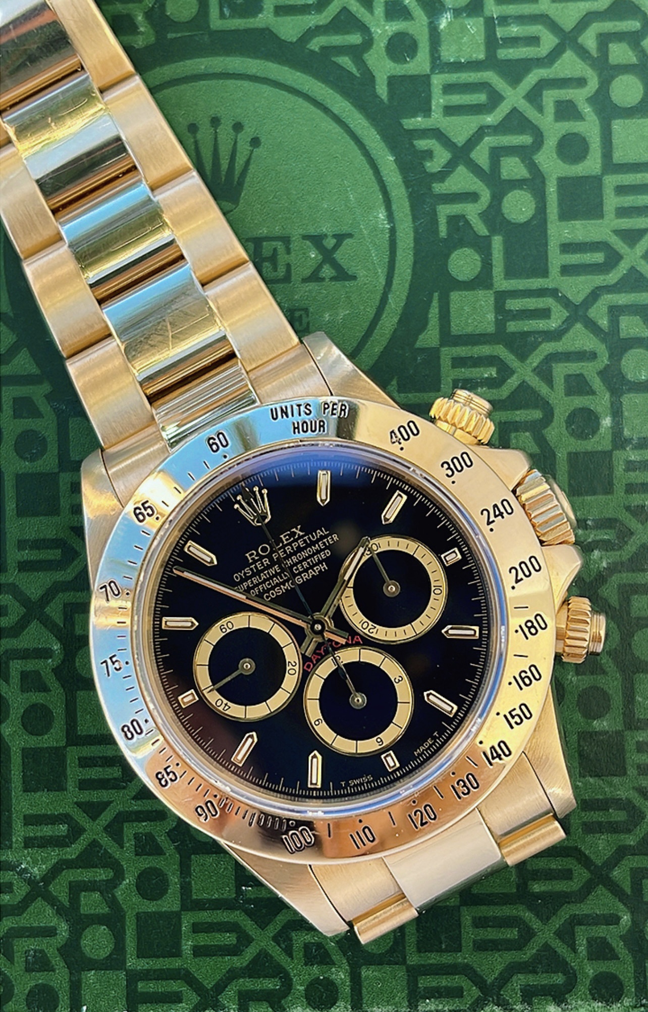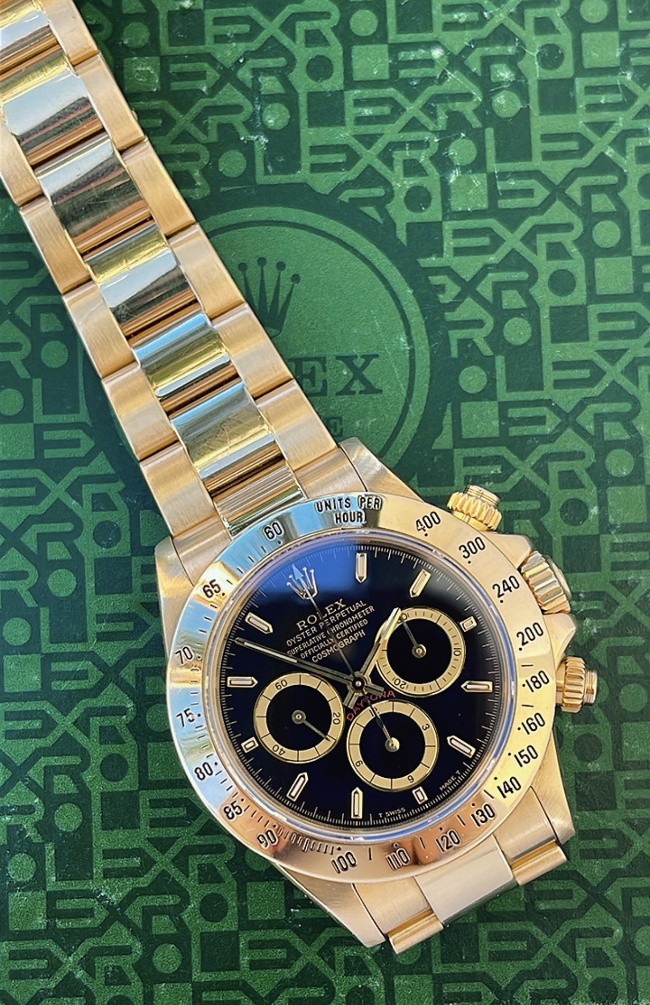 Proponiamo in vendita un pezzo rarissimo e iconico della produzione Rolex: il Daytona ref. 16528 con movimento Zenith El Primero, in versione completamente in oro giallo 18kt, anno 1989, completo di corredo originale – full set.
